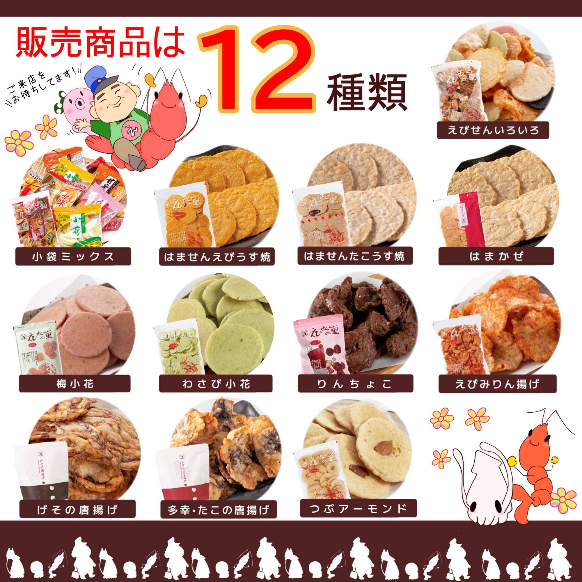 | 『イオンモール木曽川』にて催事販売を行います! 人気ナンバー1「えびせんいろいろ」をはじめ、看板商品「はません えびうす焼」など 15種類を販売いたします。冬季限定「りんちょこ」もありますよ! 皆様のお越しをお待ちしております(^ ^)♪ ■場所 イオンモール木曽川 1階サウスコートA 1階イオン側入口(東入口・西入口)近くエスカレーター前 愛知県一宮市木曽川町黒田南八ツヶ池25‐1 ■出店日時 2025年11月29日(土) 10:00~19:00 2025年11月30日(日) 10:00~18:00 ■支払方法 現金・PayPayのみ イオンモール木曽川のホームページはこちら ■販売商品 15種類 ①えびせんいろいろ ②小袋ミックス ③えびみりん揚げ ④えびせんかりんとう ⑤はません えびうす焼185g ⑥はません たこうす焼185g ⑦はまかぜ170g ⑧多幸・たこの唐揚げ ⑨げその唐揚げ ⑩梅小花 ⑪わさび小花 ⑫つぶアーモンド ⑬えび三昧 ⑭りんちょこ(冬季限定) ⑮ごぼうせんべい |